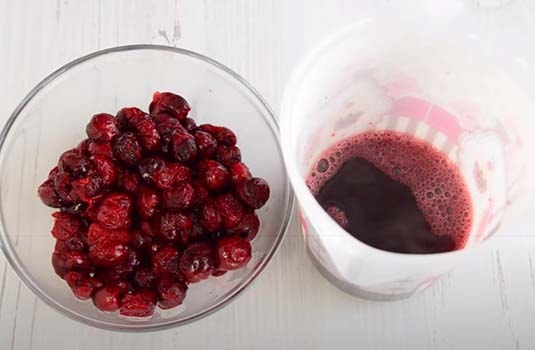 Измельчаем вишню погружным блендером. Добавляем разбухший желатин, причем разогревать его не надо.