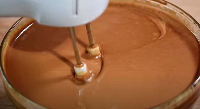 Тонкой струйкой вливаем его в сметанную смесь, не переставая взбивать миксером.