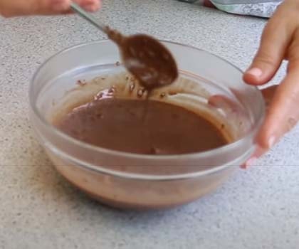 В другую миску кладем шоколад, сливочное масло и заливаем горячей водой. Перемешиваем до однородности.
