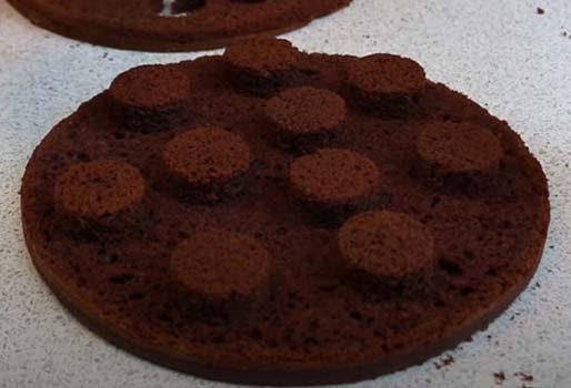 У бисквита срезаем верхушку и разрезаем на два коржа.