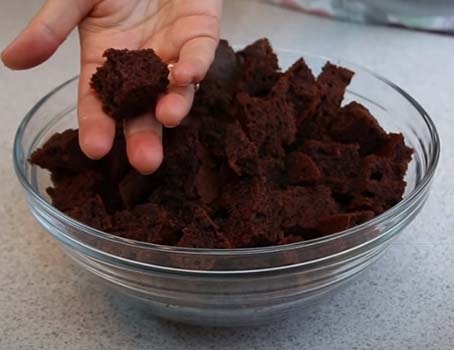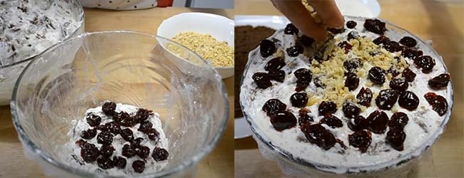 В оставшийся крем кладем кусочки мякоти бисквита. Сюда же кладем вишню, и все хорошо перемешиваем.