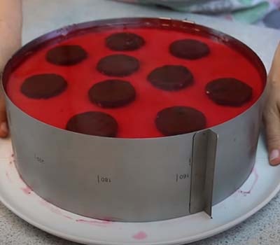 Достаем из холодильника торт и выкладываем вишню на муссовый слой. Аккуратно заливаем желатиновым соком. Накрываем пленкой и ставим на холод на 6 часов.