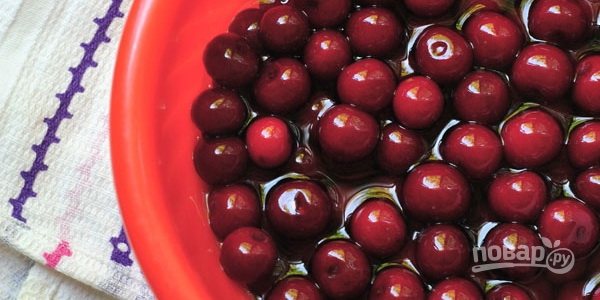 - Если взяли консервированную вишню, то выложите ее в дуршлаг, чтобы стек сок. Она изначально сладкая, поэтому этап с привариванием пропустите. Залейте ее бренди.