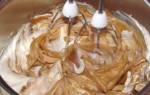 Небольшими порциями начинаем подливать к нему сгущенку, хорошенько взбивая миксером. Откладываем немного крема для украшения и промазывания боков.