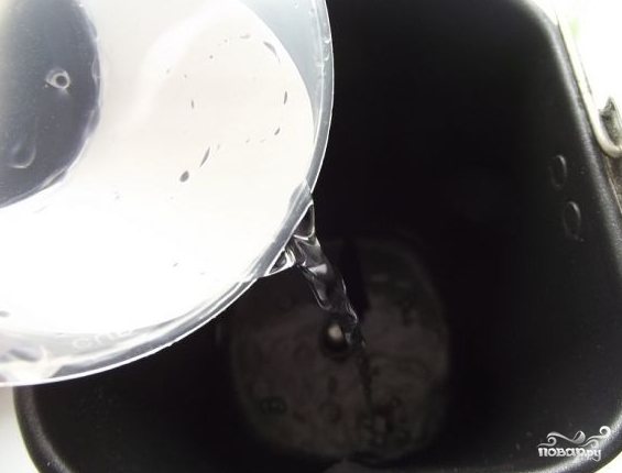 - Смешайте воду с маслом, влейте ее в емкость хлебопечки.