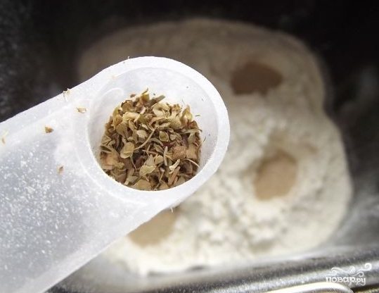 4. Положите ложечку орегано. Приправу можно добавить перед тем, как хлебопечка начнет последнее замешивание, после сигнала.