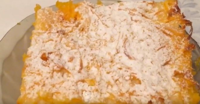 - Вынуть форму из духовки, дать немного остыть и переложить на блюдо. Сверху запеканку можно посыпать пудрой.