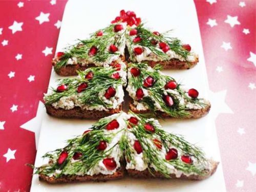 Применив простейший дизайн к украшению блюда, лакомство превратится в новогоднюю елку. Кусочки бутербродов выложите в виде елочки, украсьте зеленью укропа, поверх распределите зерна граната. Получается очень оригинально и красиво. Рецепты с фото простых бутербродов с печенью трески на праздничный стол порадуют всех хозяек.