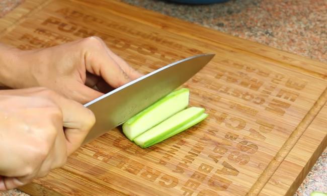 - Кабачки почистить, нарезать крупными длинными кусочками.