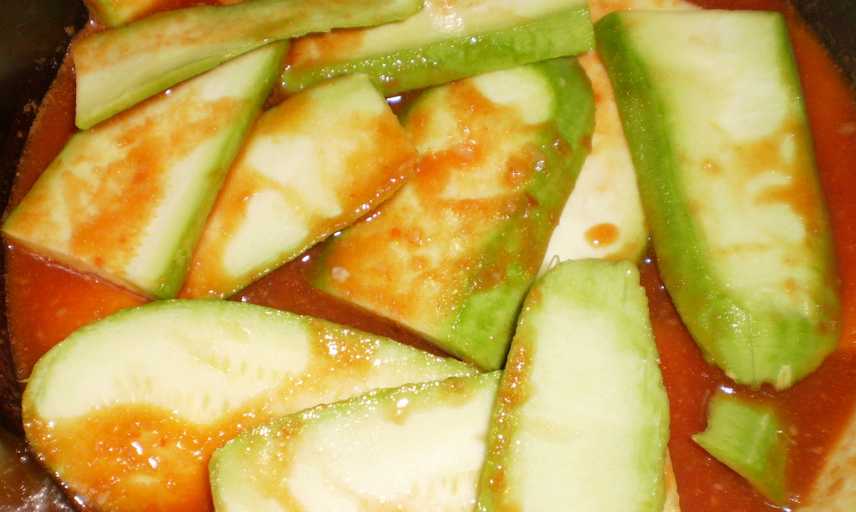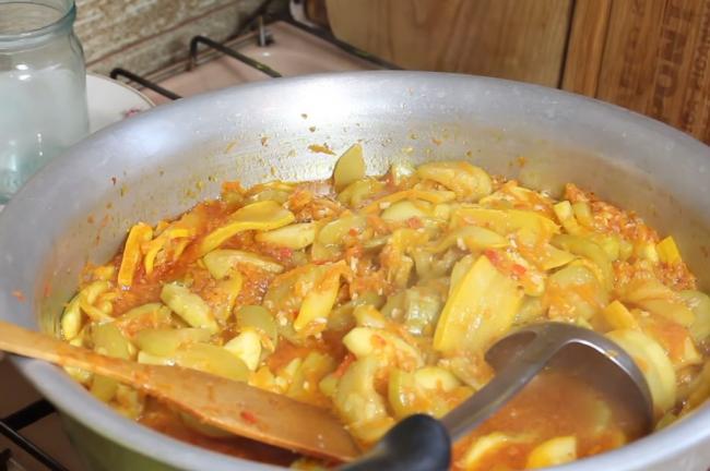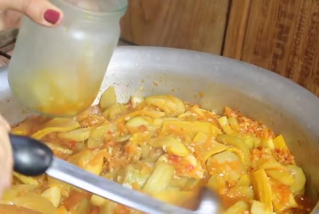 Взять казан или алюминиевую кастрюлю и тушить кабачки 40-50 минут. За 10 минут до их готовность, добавить чеснок, перец и уксус. Обильно размешать и готовить дальше.
