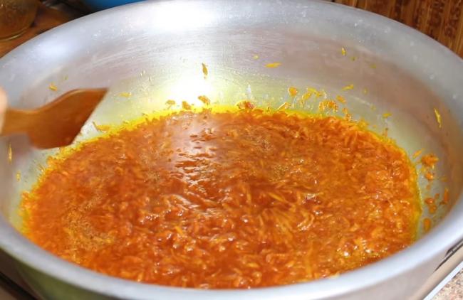 В тазике разогреваем растительное масло и отправляем в него полукольца лука. Когда он станет мягким, добавляем тертую морковь и готовим около пяти минут. После этого вливаем томатный сок, высыпаем соль и сахар. Все продукты тщательно перемешиваем.