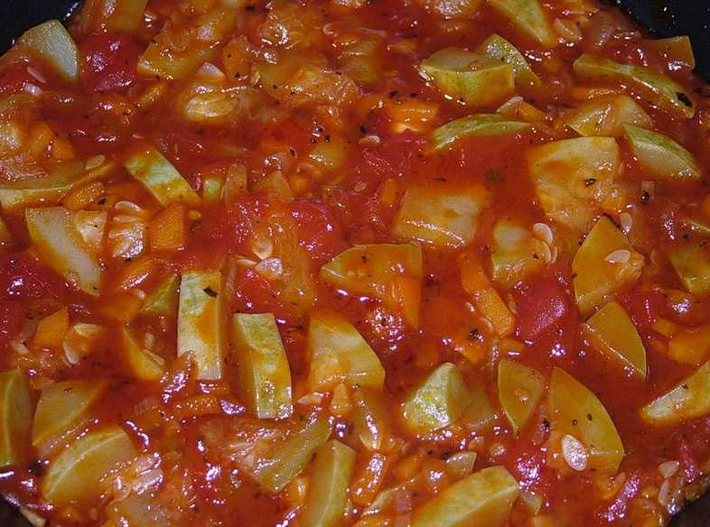 - Помойте кабачки и порежьте кубиками. Нарезку поместите в кастрюлю, залейте смесью помидоров и перцев. Вскипятите, после чего убавьте пламя. Готовьте 15 минут.